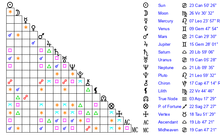 | Sun | 23 Cancer 50 | 24 Cancer 25 | 3 Libra 18 |