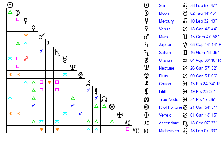 | Moon | 2 Taurus 39 | 23 Leo 4 | 9 Gemini 2 |
