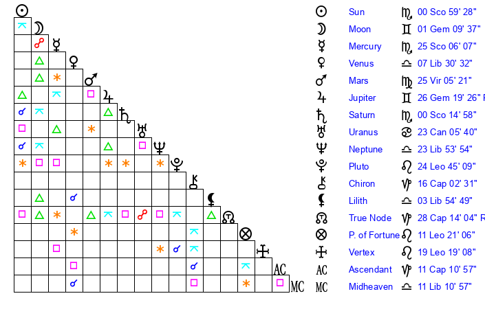 | Sun | 0 Scorpio 59 | 1 Scorpio 32 | 13 Capricorn 49 |