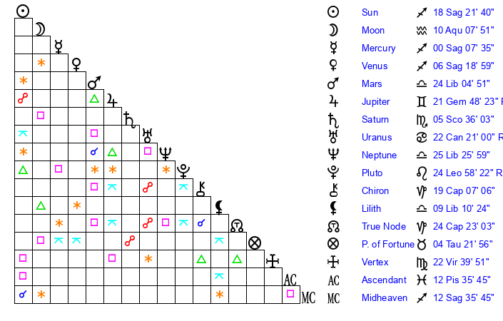 | Sun | 18 Sagittarius 21 | 18 Sagittarius 53 | 1 Pisces 32 |