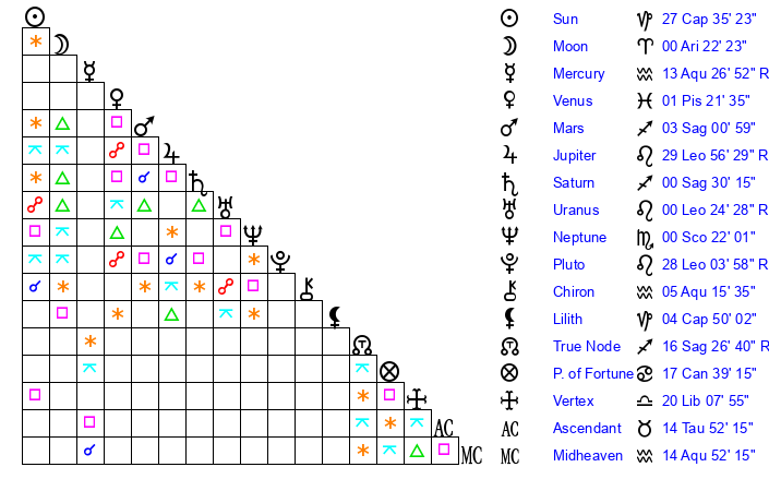 | Mercury | 13 Aquarius 26 | 15 Capricorn 11 | 27 Pisces 40 |