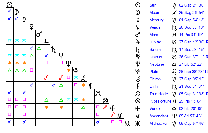 | Saturn | 18 Scorpio 7 | 25 Pisces 41 | 21 Scorpio 39 |