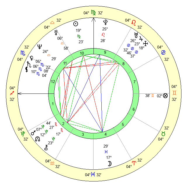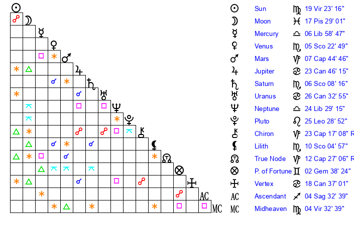 | Sun | 19 Virgo 23 | 20 Virgo 11 | 29 Scorpio 51 |