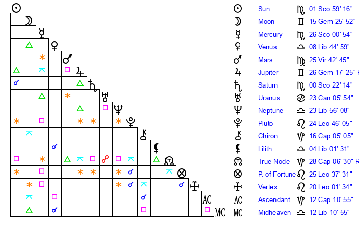 | Sun | 1 Scorpio 59 | 2 Scorpio 32 | 14 Capricorn 50 |