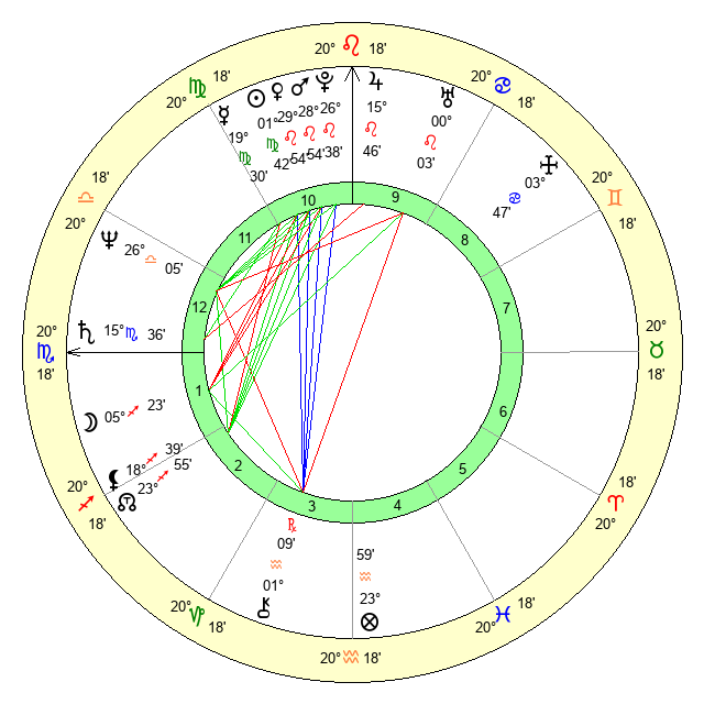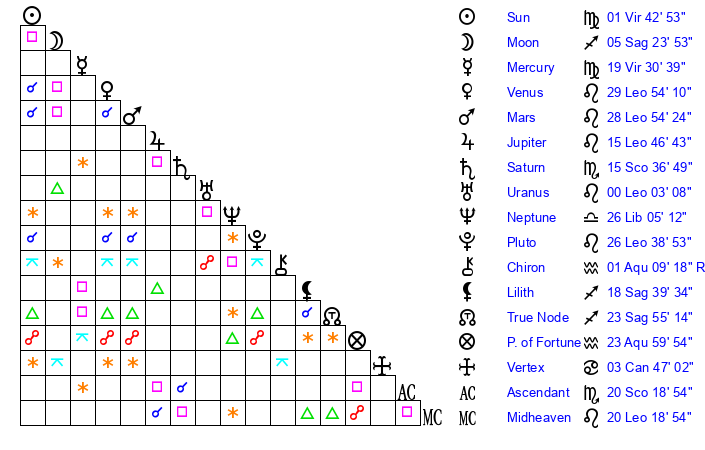 | Sun | 1 Virgo 42 | 2 Virgo 45 | 10 Scorpio 30 |
