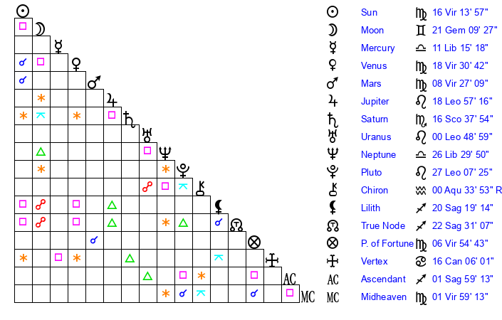 | Sun | 16 Virgo 14 | 17 Virgo 16 | 25 Scorpio 34 |