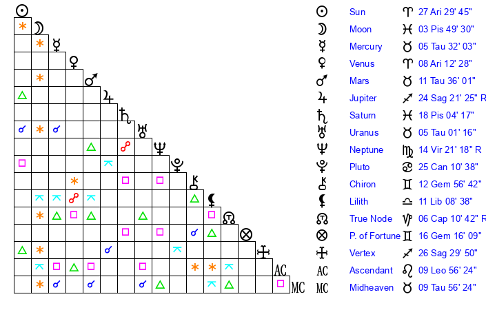 | Venus | 8 Aries 12 | 25 Pisces 4 | 27 Cancer 30 |