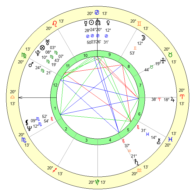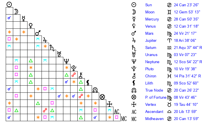 | Venus | 12 Cancer 32 | 14 Gemini 36 | 29 Virgo 9 |