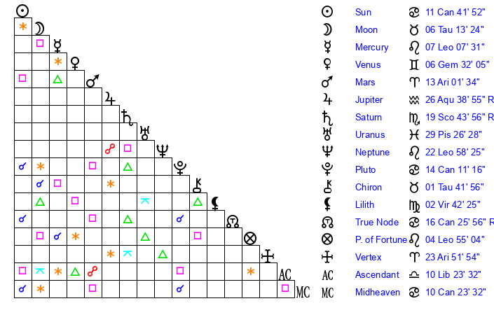 | Neptune | 22 Leo 58 | 2 Aries 10 | 26 Leo 19 |
