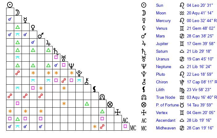 | Moon | 20 Aquarius 38 | 10 Virgo 48 | 10 Libra 41 |