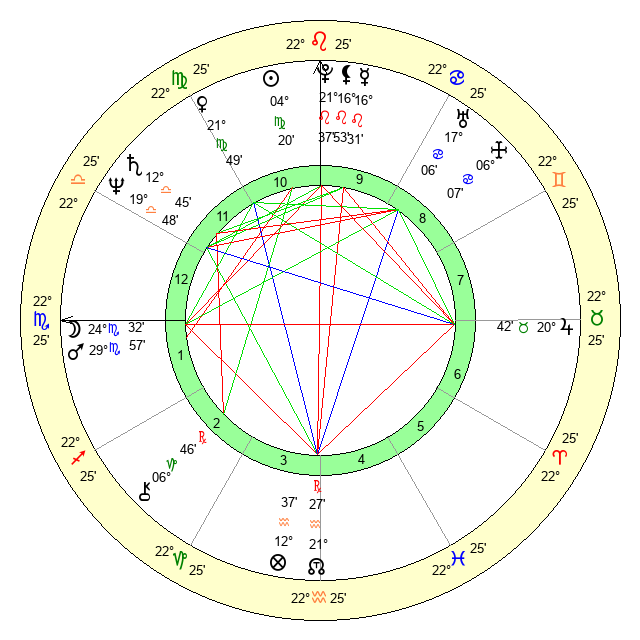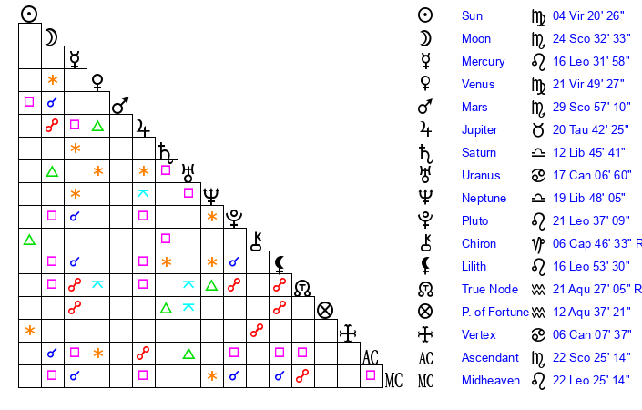 | Sun | 4 Virgo 20 | 4 Virgo 40 | 16 Scorpio 14 |