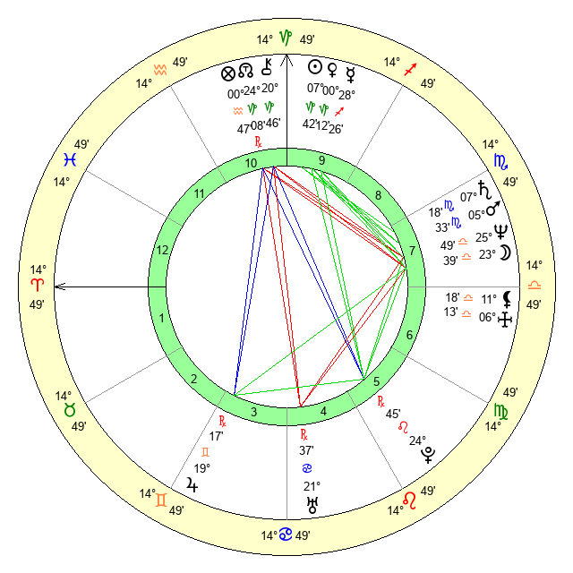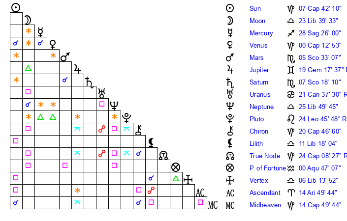 | Saturn | 7 Scorpio 47 | 25 Pisces 57 | 9 Scorpio 27 |