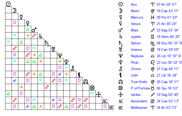 | Mars | 23 Sagittarius 53 | 22 Cancer 34 | 7 Capricorn 2 |