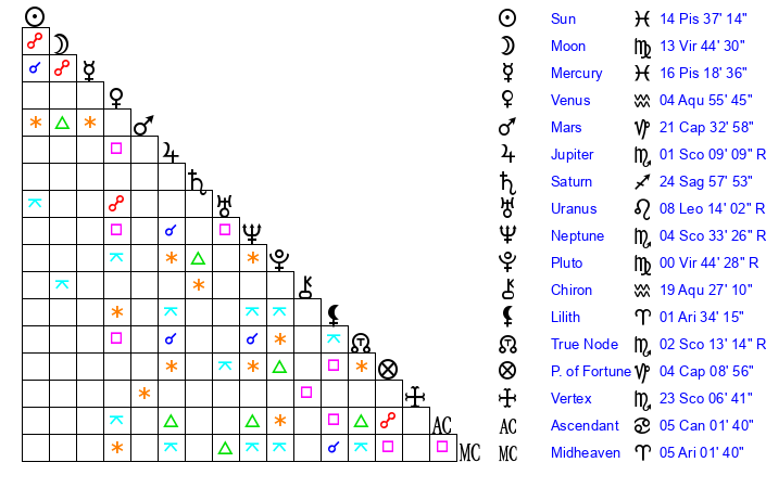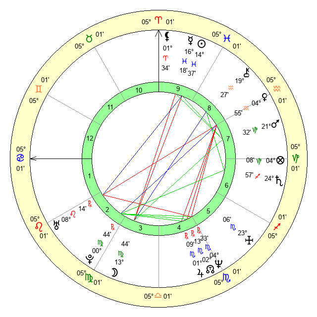 | Moon | 13 Virgo 42 | 2 Gemini 39 | 2 Pisces 48 |