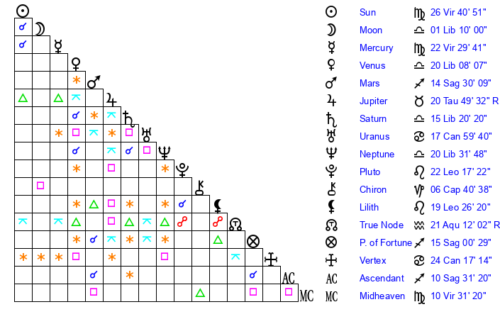 | Sun | 26 Virgo 41 | 27 Virgo 0 | 9 Sagittarius 28 |