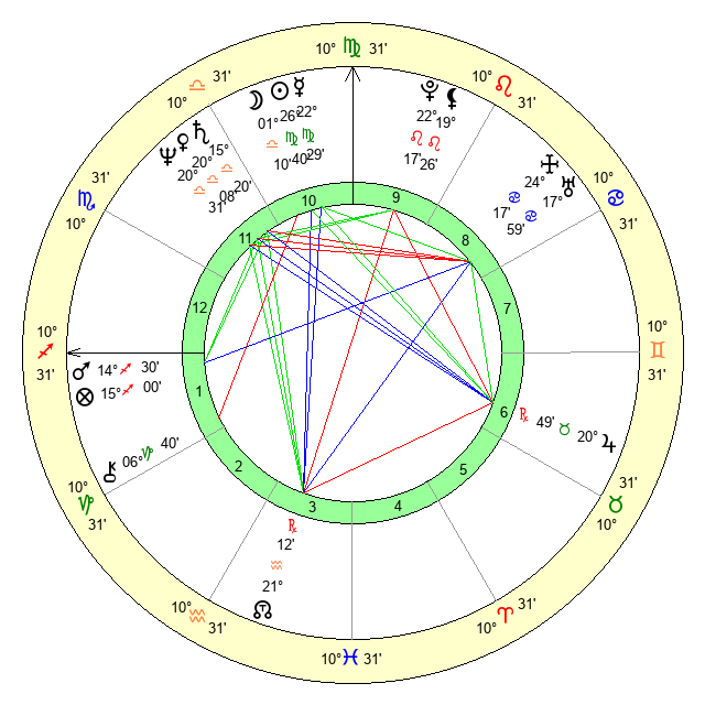 | Moon | 1 Libra 17 | 2 Virgo 17 | 11 Gemini 35 |