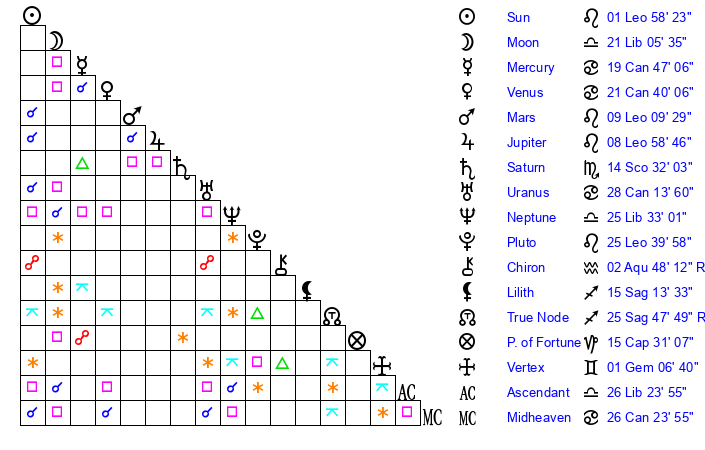 | Moon | 21 Libra 19 | 14 Leo 26 | 4 Taurus 40 |