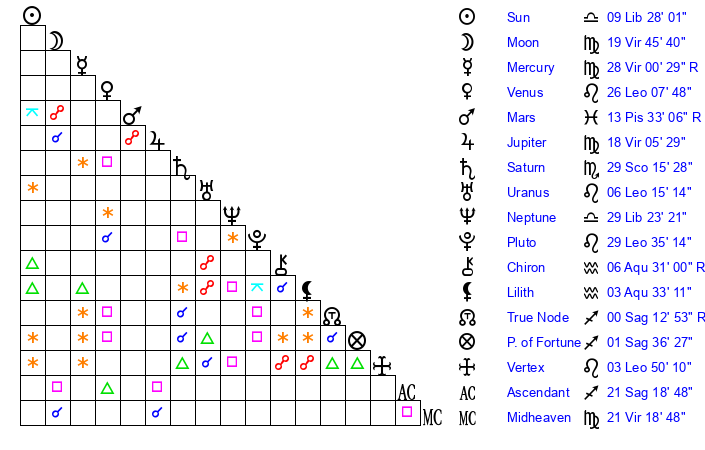 | Moon | 19 Virgo 43 | 11 Aquarius 25 | 21 Pisces 1 |