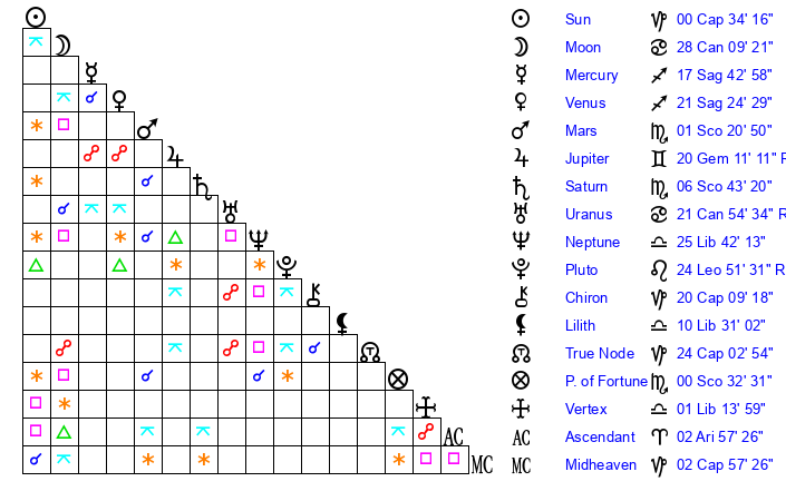 | Sun | 0 Capricorn 34 | 1 Capricorn 6 | 13 Pisces 35 |