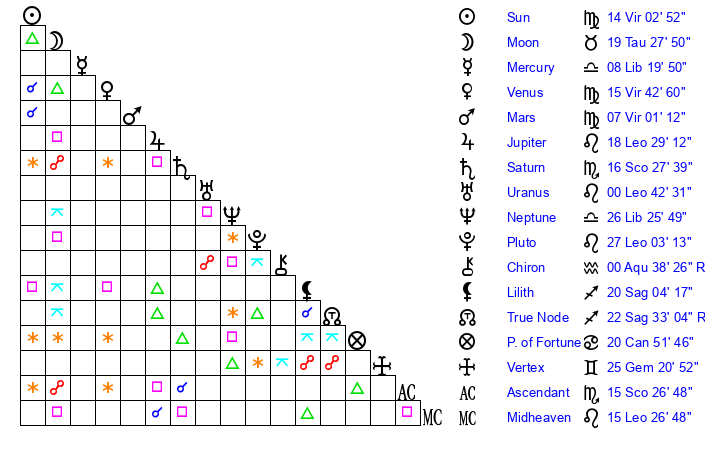| Moon | 19 Taurus 19 | 11 Pisces 6 | 14 Sagittarius 44 |