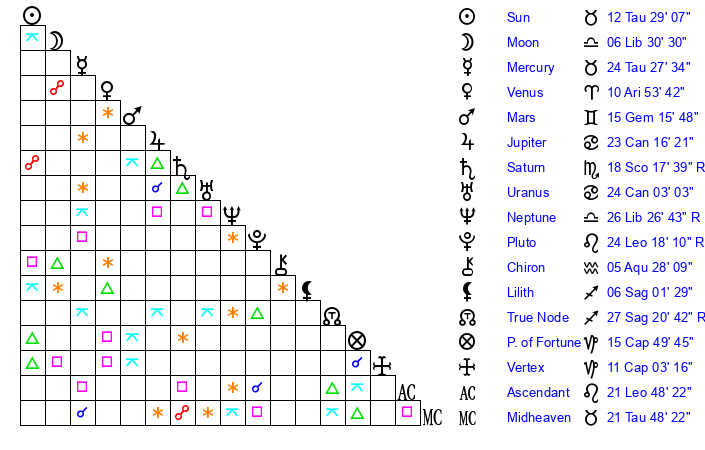 | Sun | 12 Taurus 29 | 13 Taurus 30 | 19 Cancer 33 |