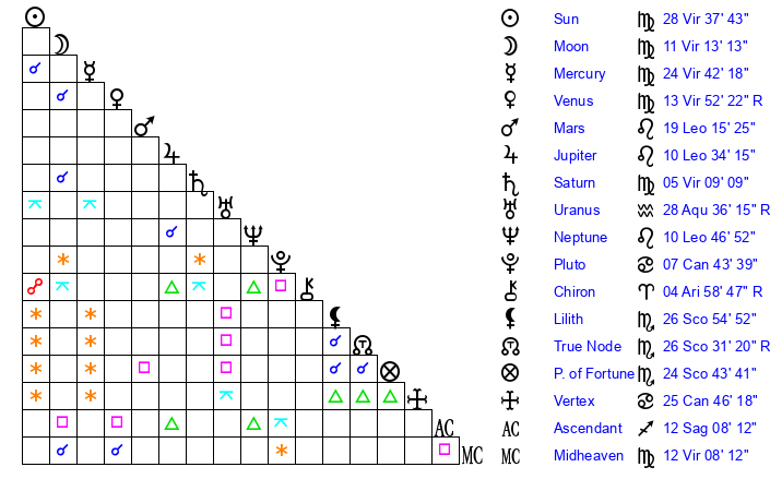 | Saturn | 5 Virgo 48 | 28 Pisces 16 | 12 Virgo 13 |