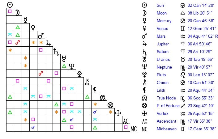 Sun | 2 Cancer 14 | 3 Cancer 23 | 24 Virgo 50 |