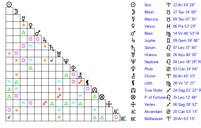 | Moon | 27 Taurus 13 | 0 Scorpio 57 | 23 Aries 55 |