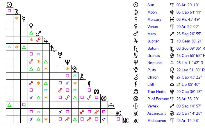 | Moon | 6 Capricorn 43 | 12 Pisces 58 | 26 Leo 22 |