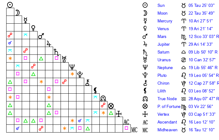 | Moon | 22 Taurus 33 | 6 Aries 0 | 18 Capricorn 0 |