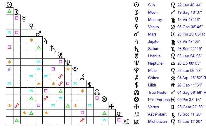 | Moon | 19 Sagittarius 17 | 16 Taurus 15 | 20 Gemini 18 |