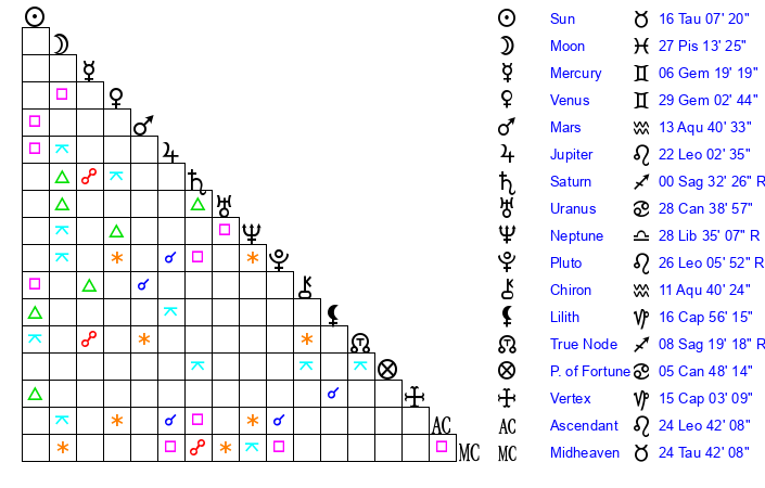| Sun | 16 Taurus 7 | 16 Taurus 25 | 22 Cancer 11 |