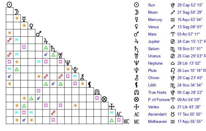 | Sun | 29 Capricorn 52 | 0 Aquarius 53 | 10 Aries 12 |