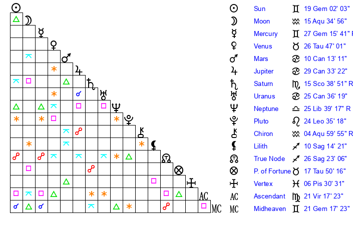 | Moon | 15 Aquarius 29 | 13 Sagittarius 11 | 20 Virgo 12 |