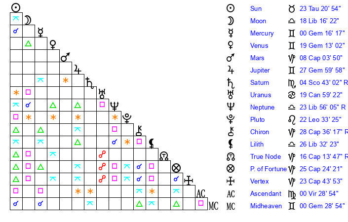 | Moon | 18 Libra 13 | 16 Sagittarius 18 | 23 Taurus 41 |