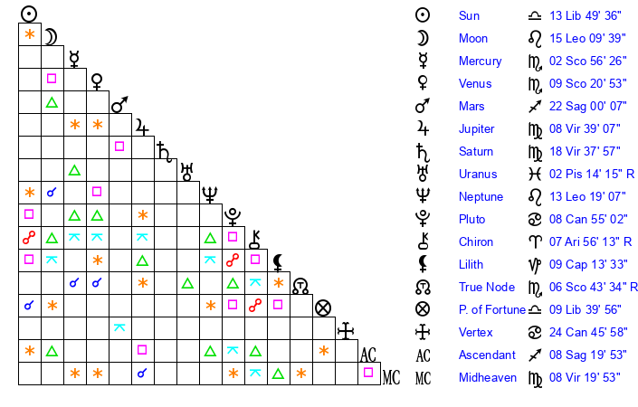 | Saturn | 19 Virgo 16 | 27 Pisces 10 | 25 Virgo 17 |