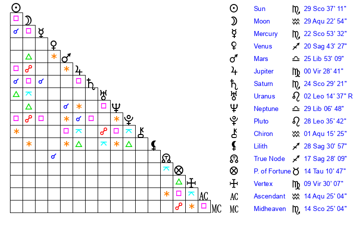 | Sun | 29 Scorpio 37 | 0 Sagittarius 39 | 10 Aquarius 48 |