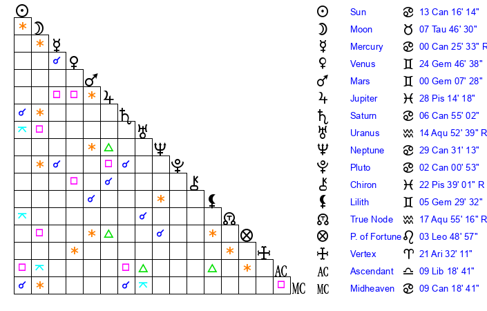 | Sun | 13 Cancer 16 | 14 Cancer 37 | 29 Libra 56 |