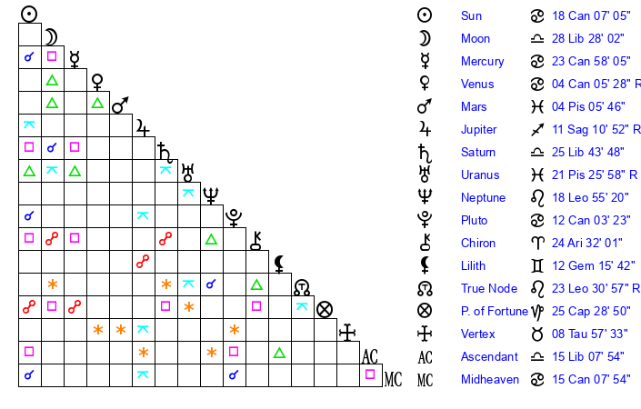 | Sun | 18 Cancer 7 | 18 Cancer 41 | 26 Libra 2 |