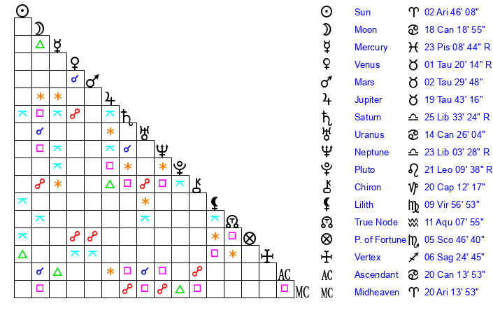 | Sun | 2 Aries 46 | 3 Aries 19 | 12 Gemini 48 |