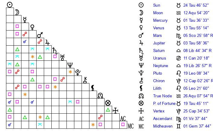 | Sun | 24 Taurus 47 | 25 Taurus 7 | 4 Leo 34 |