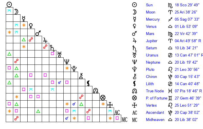 | Sun | 18 Scorpio 30 | 19 Scorpio 33 | 3 Aquarius 40 |