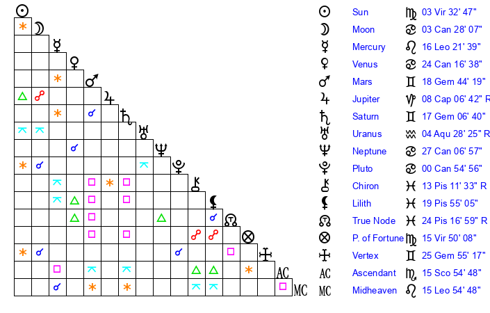 | Moon | 3 Cancer 20 | 22 Libra 49 | 13 Leo 2 |