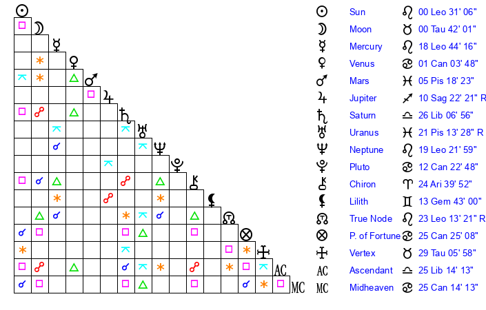 | Moon | 0 Taurus 48 | 16 Cancer 48 | 9 Capricorn 42 |