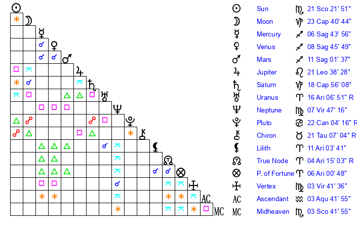 | Sun | 21 Scorpio 22 | 22 Scorpio 34 | 26 Aquarius 49 |