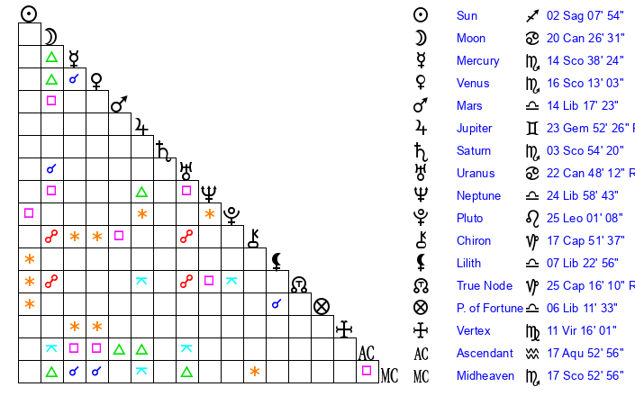 | Neptune | 24 Libra 59 | 29 Pisces 26 | 26 Libra 2 |