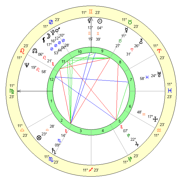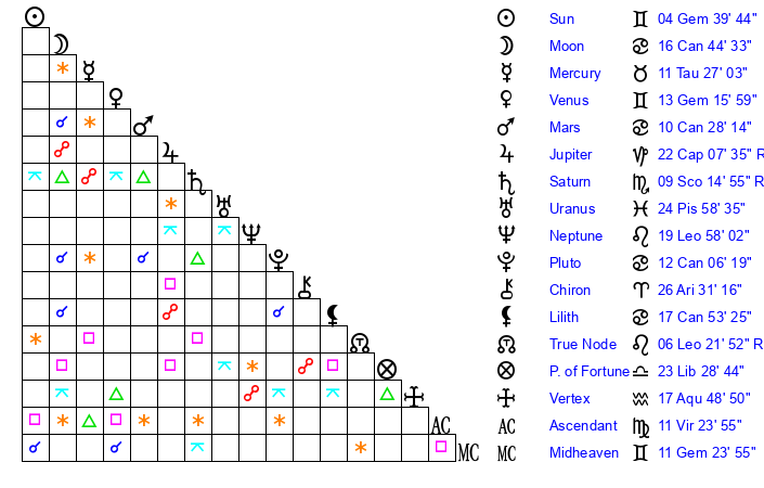 | Sun | 4 Gemini 40 | 5 Gemini 27 | 10 Virgo 25 |