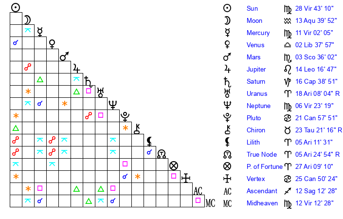 | Neptune | 6 Virgo 24 | 0 Aries 46 | 7 Virgo 55 |