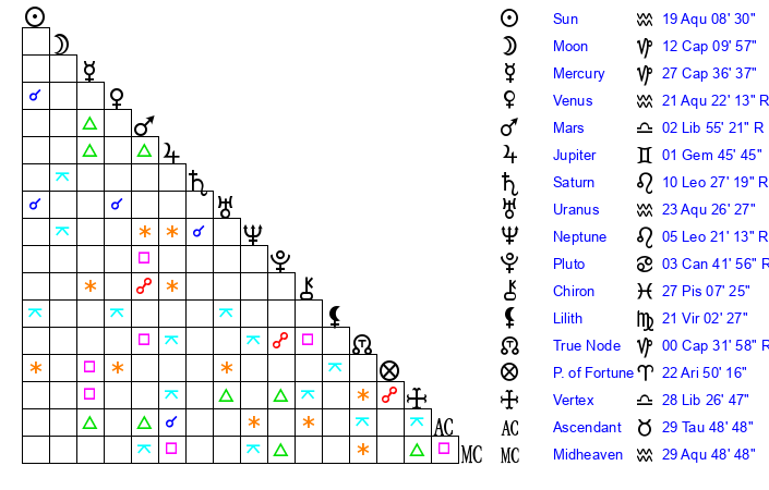 | Sun | 19 Aquarius 8 | 20 Aquarius 11 | 4 Gemini 36 |
