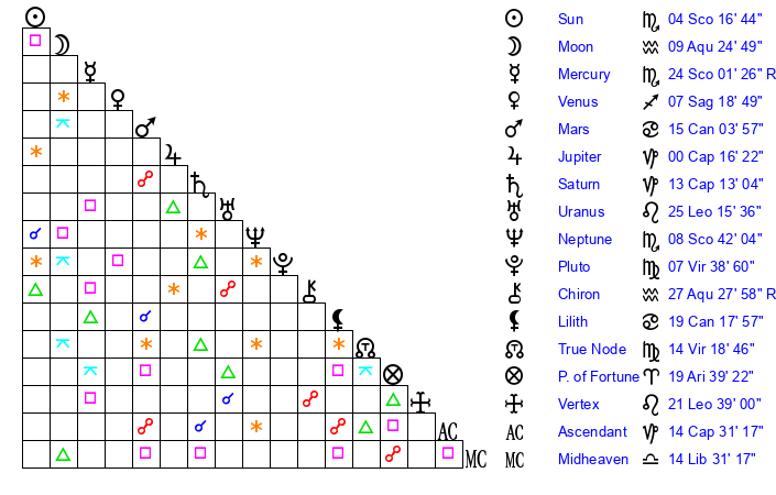 | Sun | 4 Scorpio 17 | 4 Scorpio 32 | 10 Capricorn 3 |